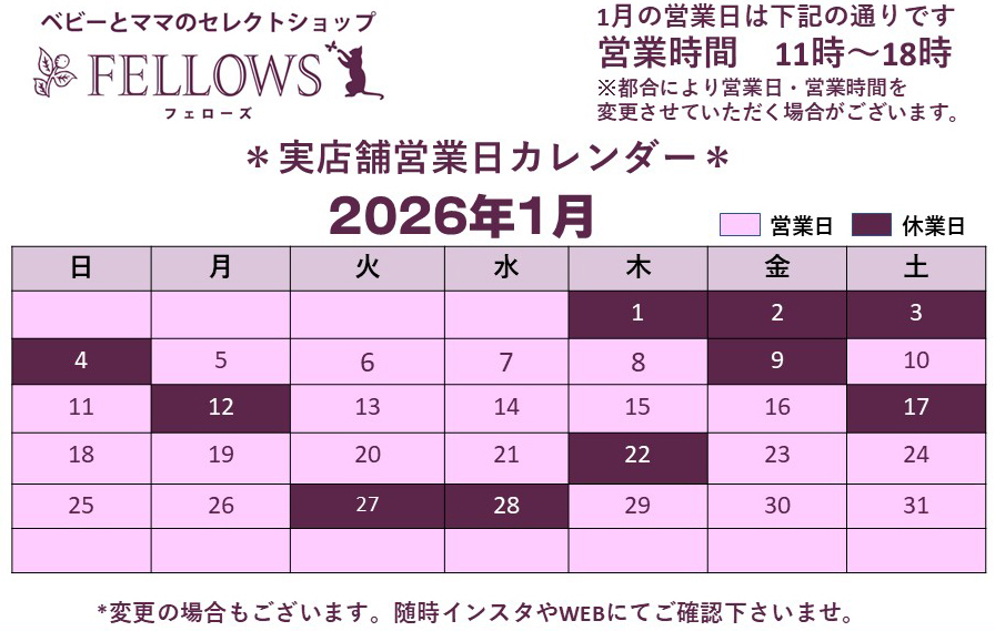 ようこそ いらっしゃいませ。ベビー&キッズ&ママのセレクトショップFELLOWSです。●SHOP TEL:0422-29-7701 ●営業日・営業時間は下記カレンダーご参照下さい。*変更の場合もございます。随時webやインスタ等ご確認くださいませ。