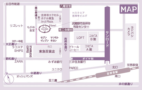 住所:〒180-0004 東京都 武蔵野市 吉祥寺本町2-4-6 H-スクエア吉祥寺1F <アクセス方法> 吉祥寺の東急百貨店さんの近くにございます。東急百貨店さんの北口を出ますと、目の前にセブンイレブンがあり、左手脇のNEW BALANCEストアを右折⇒直進していただくと右手 H-スクエア吉祥寺1階にFELLOWSがございます(吉祥寺エクセル東急ホテル裏出口すぐ横です)。入口外にベビーカーも置けますので、是非ご来店お待ちしております!(※駐輪場、駐車場のご用意はございません。)吉祥寺の実店舗では、ネットショップで販売中の商品と店舗在庫は異なります。ご来店前にご予約いただければお客様のご希望の商品を出来る限り実店舗にご用意させていただきます。実店舗の在庫についてはどうぞお気軽にお電話下さいませ。 © Fellows(出産祝い&輸入雑貨)